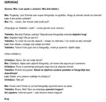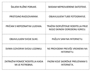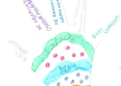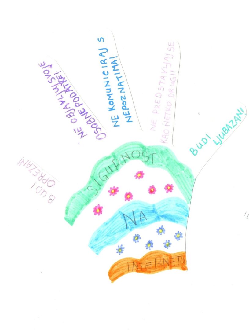 S učenicima 1. i 2. razreda razgovarali smo o osobnim podatcima i naglasili njihovu važnost kroz poruku „Čuvaj svoje osobne podatke kao svoje blago!“. Trebali su prepoznati koji su podatci osobni te koje je ponašanje dobro, a koje loše. Nacrtali su i dlan svoje ruke te na svaki prst napisali pravilo odgovornog ponašanja na internetu. Također smo razgovarali o dobnim granicama za pristup društvenim mrežama, koje učenici već u ranoj dobi vješto znaju zaobilaziti.